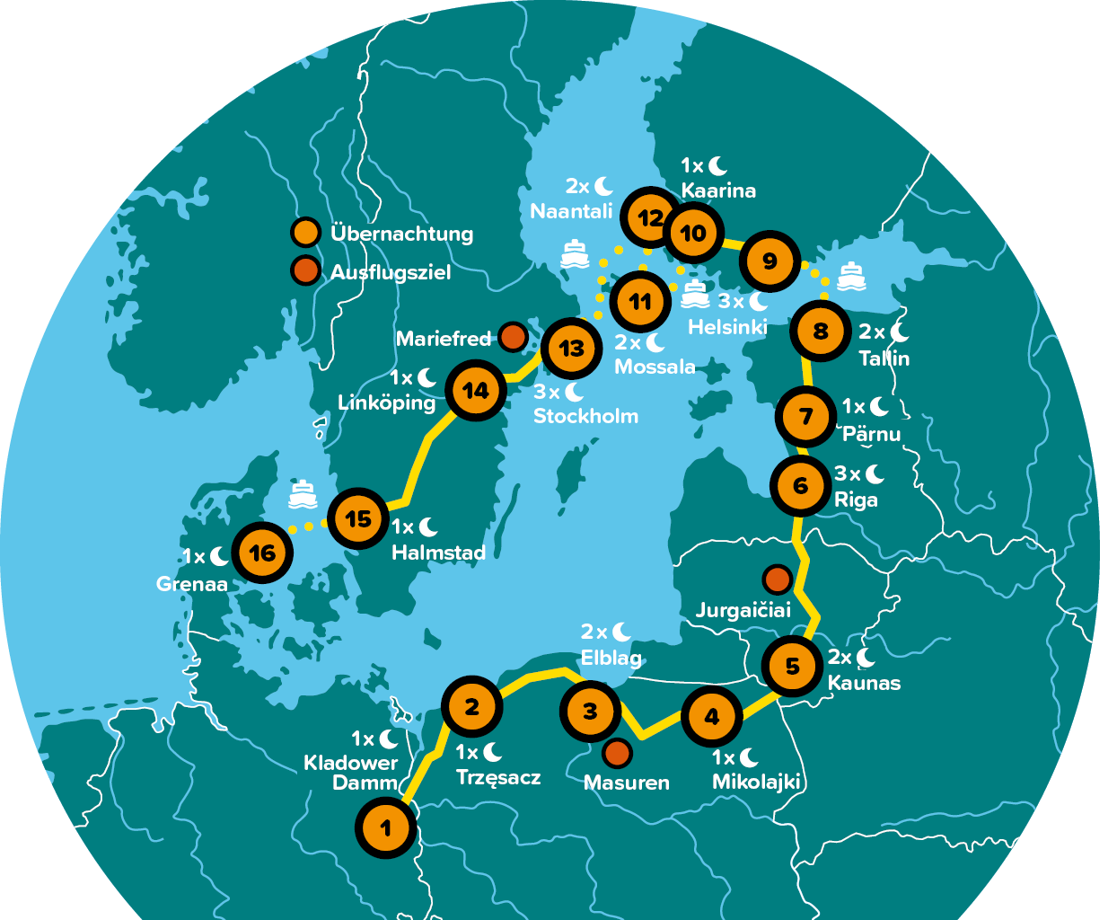 Start dieser Reise ist in Deutschland, über Polen und die Masuren, weiter ins Baltikum nach Litauen. Wir besuchen Lettland und Estland und fahren anschließend mit der Fähre nach Helsinki in Finnland, dem Land der tausend Seen, zum Island Hopping im finnischen Schärenmeer durch zauberhafte Landschaften. Zurück auf dem finnischen Festland, geht es per Fähre nach Stockholm und weiter nach Dänemark, wo unsere schöne Reise um die Ostsee endet.