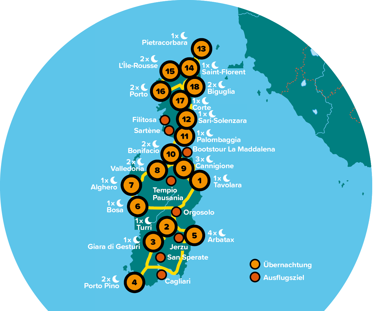 1. Tag: Wir treffen uns morgens am Fährhafen Livorno. Hier startet unsere Tagesfähre nach Olbia. Abends übernachten wir auf einem nahegelegenen Campingplatz, wo wir auch unser Willkommensmenü genießen werden.